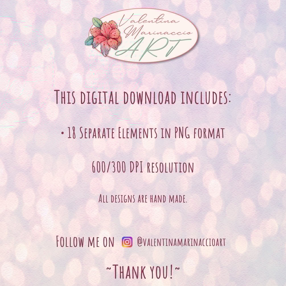 🌸 The set contains 18 wedding-themed clip art, ready to download and print for as many projects as you need.